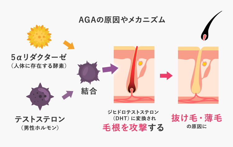 男性ホルモンのテストステロンが5α還元酵素でジヒドロテストステロン(DHT)に変わると、毛乳頭の毛母細胞に抑制的に作用し、毛の成長がストップします。すると成長期が短縮し、通常よりも早く毛が抜けてしまい薄毛になっていきます。